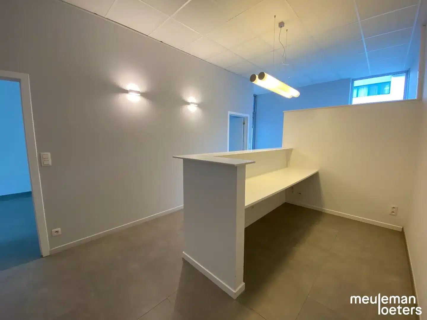 Een ruime inkom, een balie met plaats voor één à twee werknemers, een vergaderruimte met voldoende lichtinval (voorzien van privacy stickers).