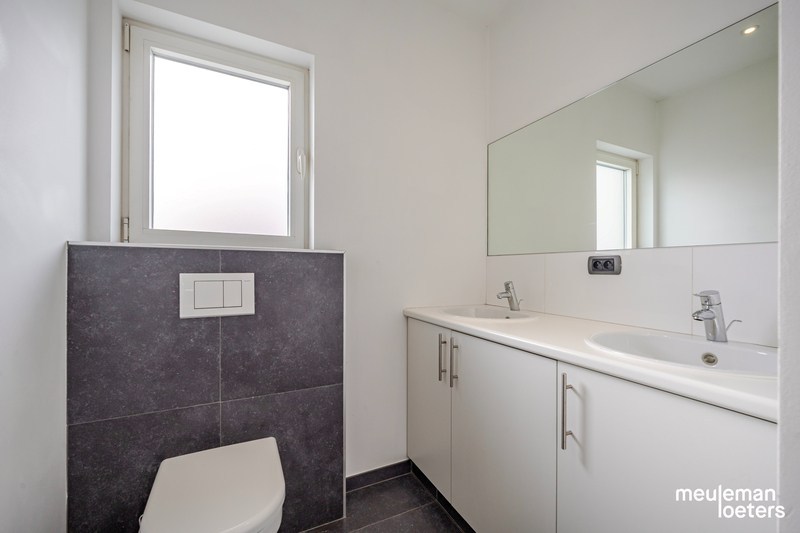Op de verdieping bevinden zich drie slaapkamers (2x tweepersoons- en 1 kinderkamer) en een tweede badkamer (toilet en dubbele lavabo).